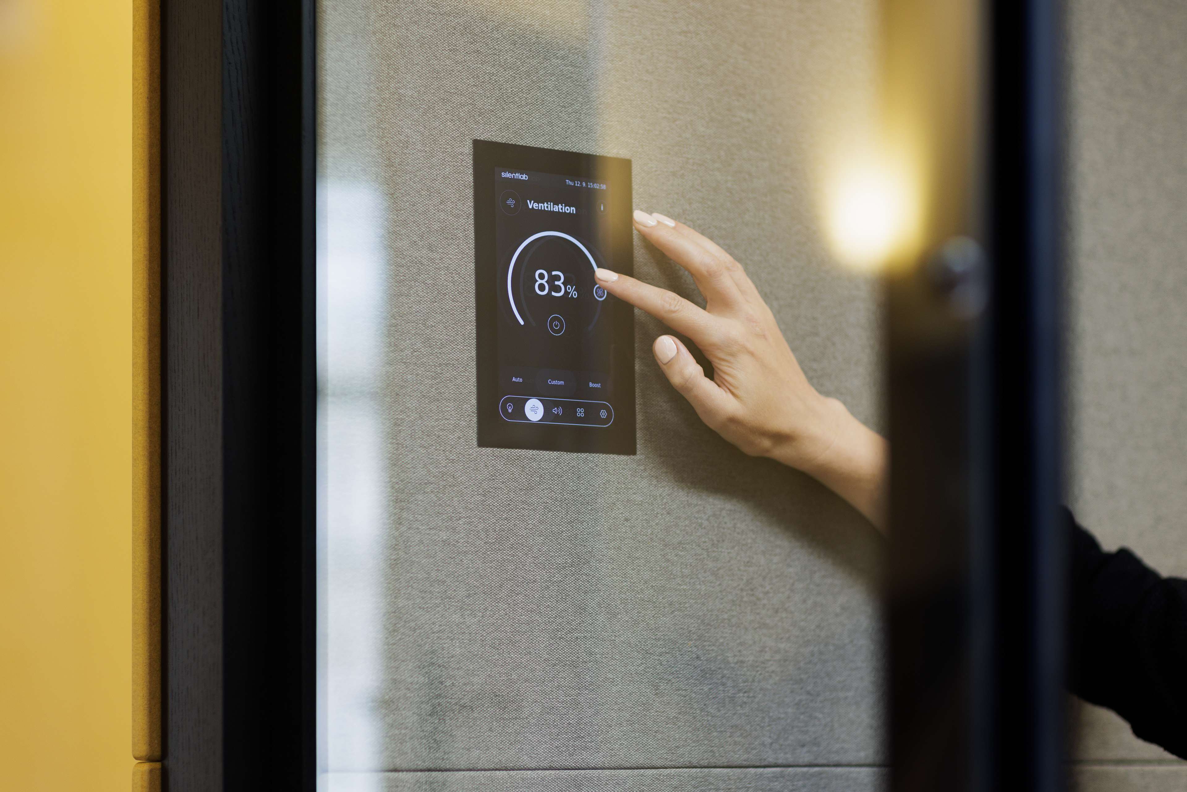 steuern sie bequem die Beleuchtung, Belüftung und Hintergrundgeräusche. Als Vorteil können Sie eine Stimmung abrufen, die Lichtintensität anpassen und die richtige Athmosphäre für Produktivität, Entspannung oder mehr einstellen - mit einer einzigen Berührung.